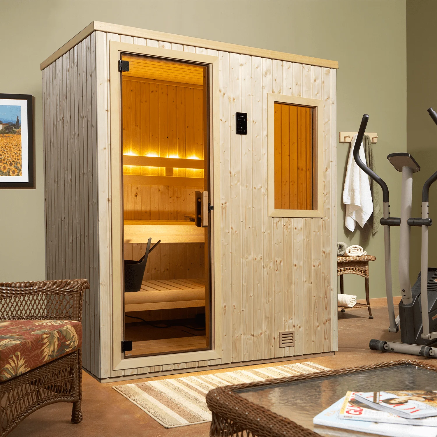 This truely Finnish sauna is Made in the USA, and features a sidelight window, LED RGBW lighting, authentic Nordic White Spruce walls, a Designer-SL2 heater and more. Simple assembly and a beautiful design makes it easy to bring sauna home. The SaunaLogic2 control with worldwide mobile app further enhances the ease by making it possible to control your sauna, your way. From your phone or the control on the room – get ready to sauna simply. Seating capacity: 2, Heater: Designer-SL2, Lighting: In-backrest low voltage + color therapy system, Floor: Integral floor with waterproof surface, Accessories: RENTO Pisara Bucket and Ladle